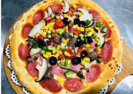 5. 预热烤箱,将披萨放入烤箱烤制15-20分钟,直到芝士融化,披萨底部金黄酥脆。